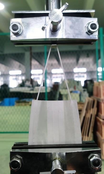 用適當(dāng)?shù)膴A具分別固定口罩耳帶和口罩體,啟動(dòng)YG026B型織物強(qiáng)力機(jī),將口罩帶拉斷,如果是一次性醫(yī)用口罩,看其斷裂強(qiáng)力是否大于或等于10N;如果是日常防護(hù)型口罩,看其斷裂強(qiáng)力是否大于或等于20N