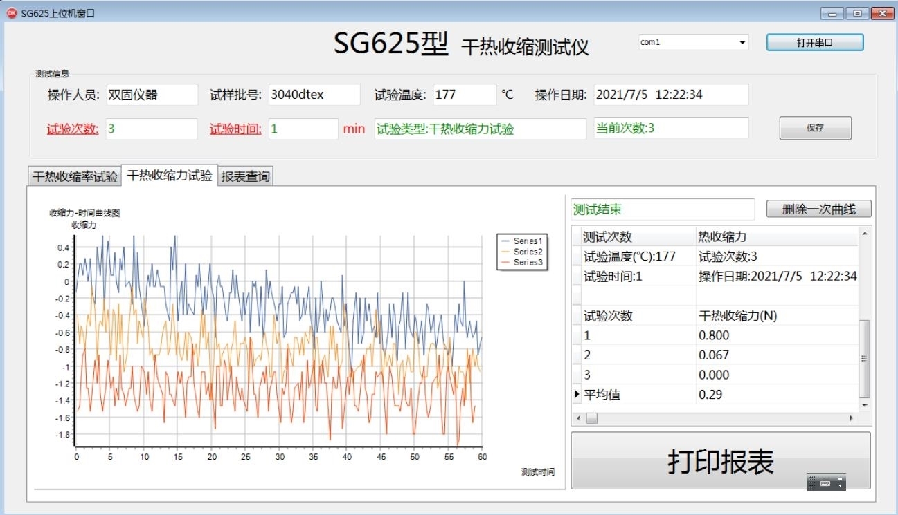 SG625-III型干熱收縮測試儀是常州市雙固頓達(dá)機(jī)電科技有限公司在原產(chǎn)品SG625型干熱收縮測試儀的基礎(chǔ)上新研發(fā)的工業(yè)絲干熱收縮率檢測儀器,增加了可以連接電腦軟件的功能,電腦端軟件可以實(shí)時(shí)查看收縮率-時(shí)間,收縮力-時(shí)間的曲線,測試數(shù)據(jù)可以保存到電腦上,支持在電腦端打印測試報(bào)告,設(shè)備的操作均在機(jī)器端完成。