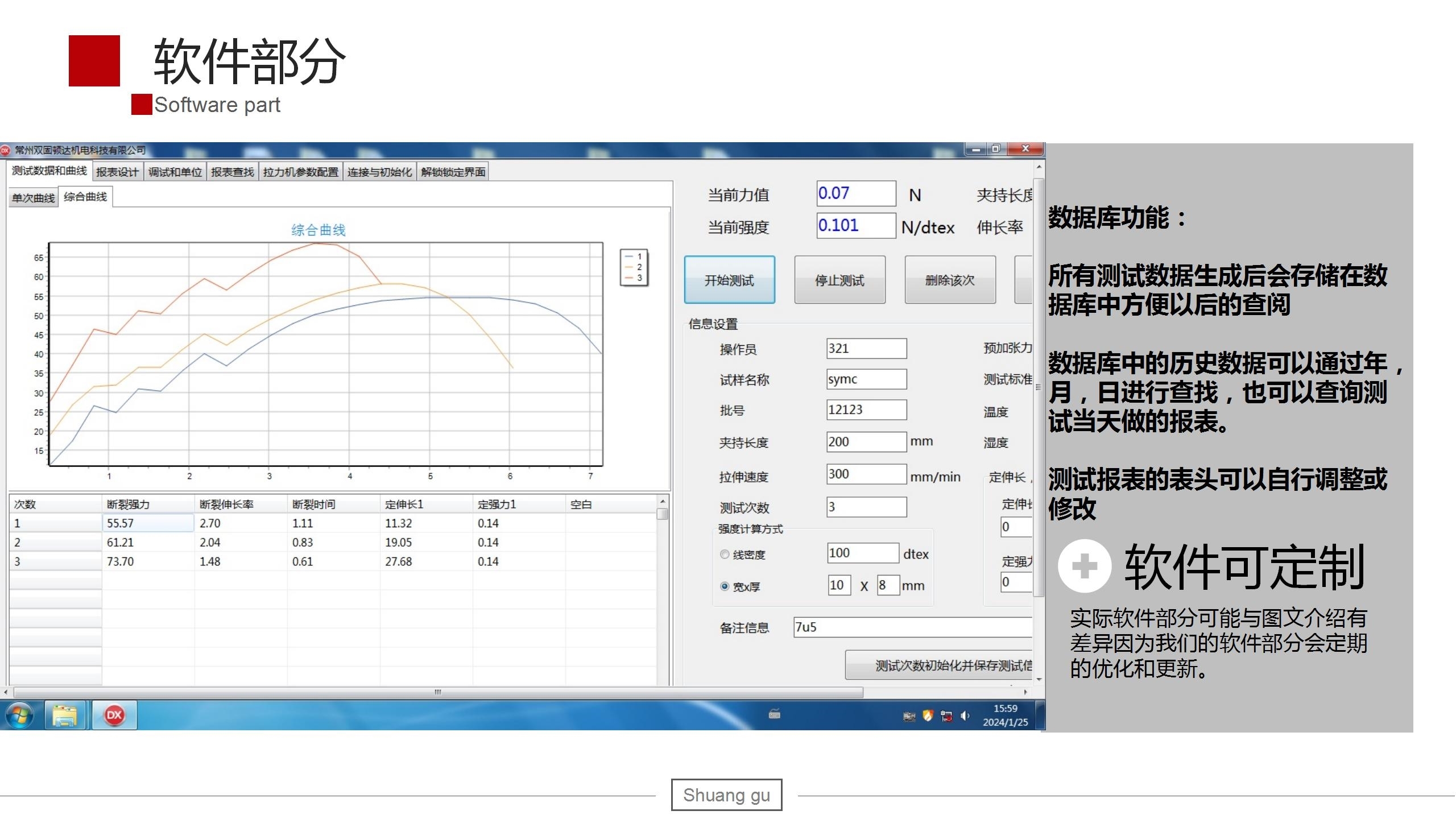 9、打?。簲嗔褟娏?,斷裂強度,斷裂伸長,斷裂伸長率,斷裂時間各種形式數(shù)據(jù),曲線及統(tǒng)計結(jié)果